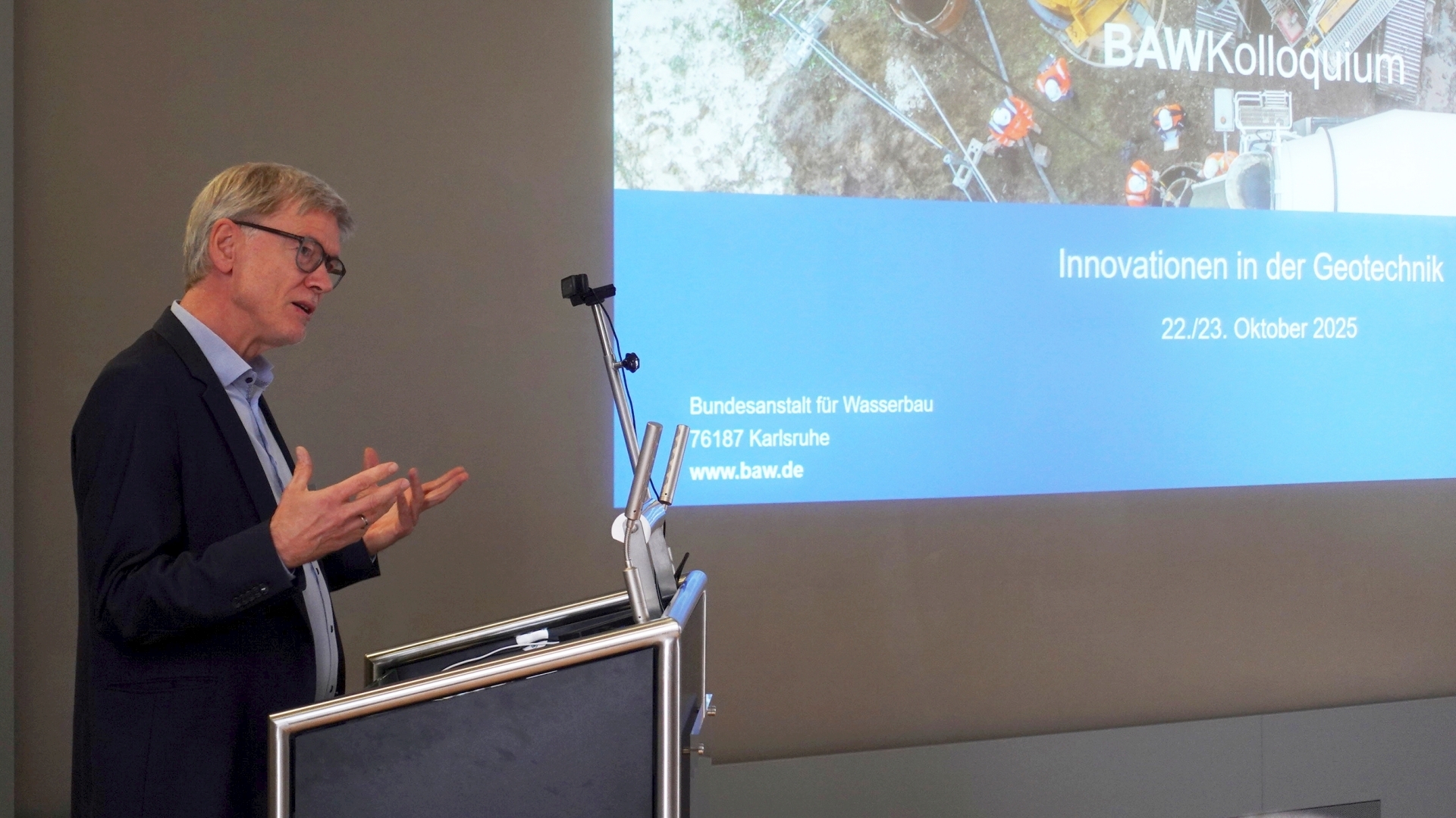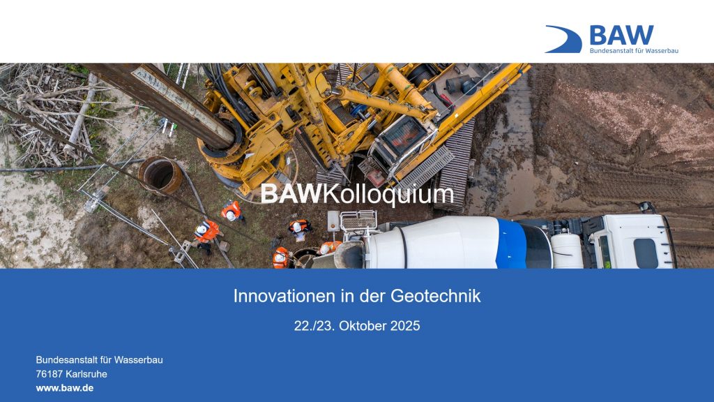 Innovation ist die erfolgreiche Umsetzung von Neuem und die damit verbundene Verbesserung eines bestehenden Zustands – und um diese neuen Ideen, Techniken und Verfahren in der Geotechnik ging es in diesem Kolloquium, das am 22. und 23. Oktober 2025 in der BAW in Karlsruhe stattfand. Mit der Digitalisierung und Automatisierung von Prozessen sowie der Etablierung neuartiger Bauweisen gehen auch BAW und WSV neue Wege. Neben den Neuerungen in der geotechnischen Praxis wurden auch die Veränderungen in der Normung und unseren Regelwerken in den Fokus gerückt. Darüber hinaus spielt bei der Entwicklung und Einführung innovativer Lösungen im Verkehrswasserbau der Aspekt der Nachhaltigkeit eine wichtige Rolle. Die Beiträge des gut besuchten Kolloquiums vermittelten einen Überblick über das aufgezeigte Spektrum von Innovationen in der Geotechnik im Rahmen der BAW- und WSV-Arbeit. An zwei Tagen gaben Vortragende aus Wissenschaft und Verwaltung interessante Einblicke in Themen aus vier verschiedenen Schwerpunkten.